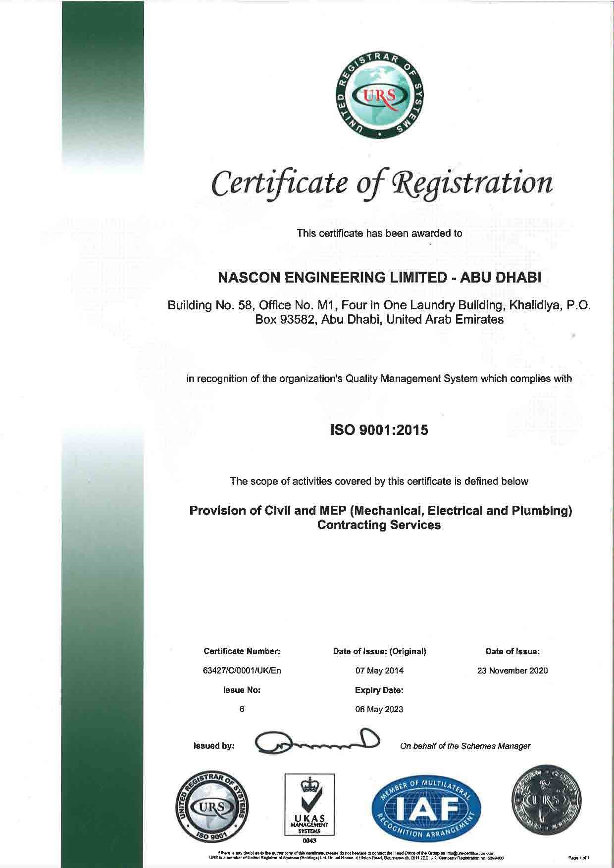 The management of Nascon Engineering dedication to quality and efficient management has led us to spearhead an initiative to secure the ISO9001:2008 Certificate for “Construction and Maintenance of Civil, Electrical and Mechanical Works”. All management processes and procedures go through rigorous internal audits so as to guarantee maximum efficiency.